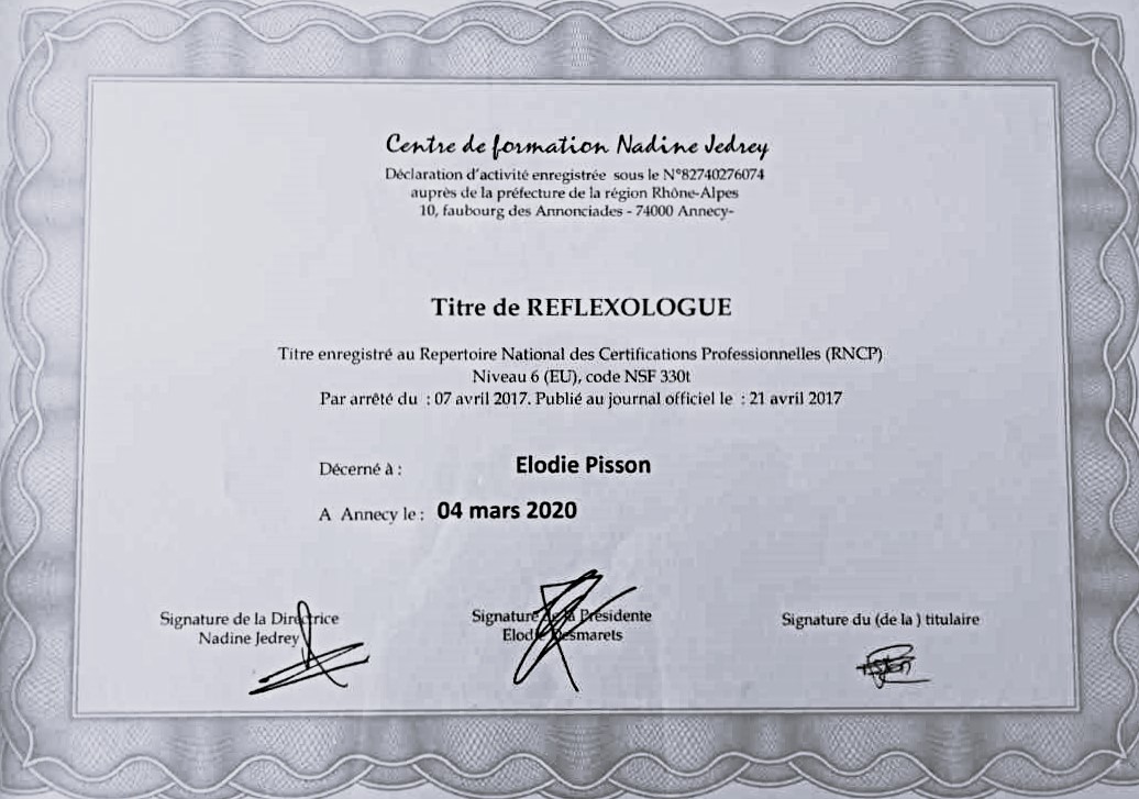 Ayant toujours été attirée par les métiers du bien-être, c’est tout naturellement que je me suis tournée vers une formation de réflexologie qui m’a permise de décrocher mon titre RNCP de réflexologue, titre reconnu par l’état et gage de qualité.